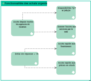 Les fonctionnalités attendues du projet de traitement des achats urgents sont relatives au temps de réponse et à la disponibilité de l'application depuis les agences de locations. Les fonctionnalités principales sont déclinées en sous-fonctionnalités.