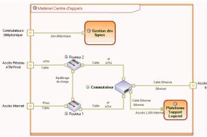 L'architecture matérielle de base d'un centre d'appels comprend trois points de liaison avec l'extérieur : un lien téléphonique, un lien vers un réseau privé ATM et un lien d'accès au réseau internet. Le point d'accès aux postes de travail permet de connecter les postes opérateur, support et dépannage.