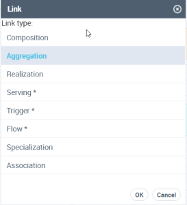 When creating a relationship, a dialog box displays the list of possible relationship types available between the two elements in the current viewpoint.