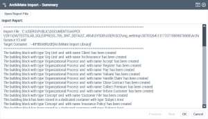 ArchiMate design can be serialized into an xml file that supports the standard objects and diagrams. The HOPEX ArchiMate import aims at importing ArchiMate Models from files so that architectures modeled in other ArchiMate modeling tools can be reused by HOPEX.