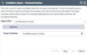 2. In the Import File of the ArchiMate Import - Parameterization dialog box, specify the path of the file to be imported.