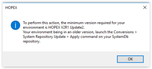 Warning 'To perform this action, the minimum version required for you environment is HOPEX V2R1 Update2…'