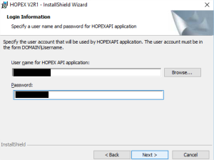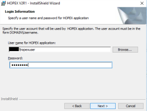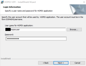 6. Enter the username and password of the Windows User for Mega Hopex you have chosen in the previous section of this document. It will be used for impersonation of the Web application: