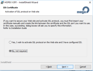 4. Choose to activate use of SSL/TLS or not. SSL/TLS is highly recommended; however, it requires some prior configuration of IIS (see Prerequisites section). Moreover, do not choose “Yes” unless the certificate is deployed in IIS. Otherwise, the installation will roll back.