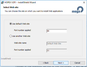 5. Choose the IIS web-site where you want to install the Hopex Web Front-End. Please note that the installer will check that there is a website running on the chosen port, and will install in the first site using that port that is available. So make sure to properly manage your websites and their ports before choosing one for the Hopex deployment. If you choose a port that is bound to no site, and that isn't listening during the installation, the setup will roll back :