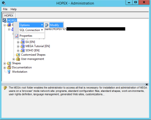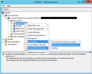 Then, from a computer where Microsoft Word is installed, go to the Administration Tool, open the environment you wish to convert with the user ‘System', navigate to the systemDB and right-click “Conversions > Convert data into current version > From HOPEX V1Rx data”, ‘x' obviously being the version of your environment in the process of being migrated: