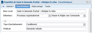 Si plusieurs enchaînements conditionnés sont issus d'une opération, vous pouvez préciser que l'un d'entre eux est utilisé par défaut. Par exemple, après avoir réalisé l'opération "Saisir la demande d'achat", l'assistant exécute toujours l'opération "Finaliser la demande" sauf si la demande n'est pas acceptable et qu'elle est en dessous d'un montant donné.