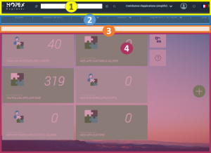 1 : Barre d'outils, 2 : Onglets de navigation, 3 : Fil d'ariane, 4 : Zone de navigation : lecture ou édition.