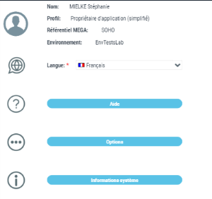 • Paramètres, qui rappelle le nom de l'utilisateur HOPEX utilisé pour la mise en correspondance et ses caractéristiques de connexion (profil, référentiel, environnement). Cette page permet :