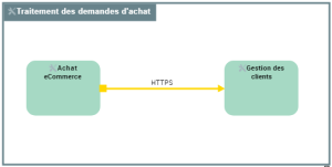 L'architecture technique d'application ci-dessous présente les zones techniques d'application pour le eCommerce et pour la gestion des clients. La ligne de communication technique entre ces deux composants s'appuie sur le protocole de communication https.