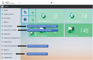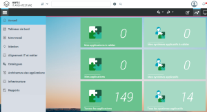 Tableaux de bord : affiche la liste des indicateurs nécessaires pour le pilotage d'objets tels que des processus, applications ou acteurs de l'organisation.