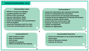 Une carte de fonctionnalités permet de décrire l'ensemble des fonctionnalités que l'entreprise est capable de couvrir pour ses besoins internes ou pour répondre aux attentes de ses clients.