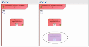 HOPEX permet de comparer plusieurs états d'un même diagramme dans le temps. Le diagramme a été photographié à des moments différents lors de la création d'instantanés du référentiel.