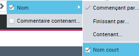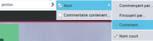 Par défaut la recherche porte sur les objets du type sélectionné et dont le nom court commence par la chaîne de caractères saisie.