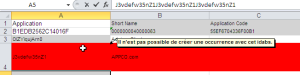 L'assistant fournit un compte-rendu des résultats de l'import dans un fichier Excel. Ce fichier s'ouvre automatiquement et marque en rouge les données qui posent problème. Dans l'exemple suivant, le fichier a identifié une application qui existe dans HOPEX mais dont l'identifiant a été modifié dans le fichier d'import.