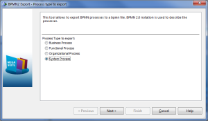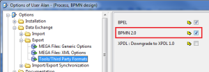 The BPMN export feature is available with MEGA Process BPMN and MEGA System BluePrint, and supports BPMN version 2.0.