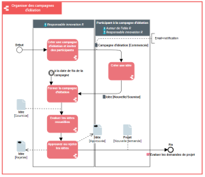 Une campagne est initiée par un responsable innovation (Innovation Manager). Elle implique plusieurs parties prenantes qui peuvent être sollicitées afin de soumettre des idées autour d'une thématique donnée.