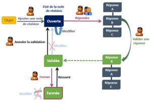 Le schéma suivant présente les actions liées aux états d'une note de révision et les éléments qui participent aux notes de révision.