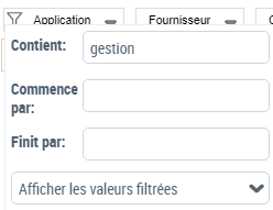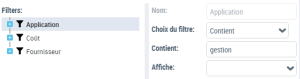 - "Application", dans le champ Choix du filtre, sélectionnez "Contient", puis dans le champ Contient, saisissez "gestion".