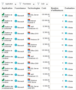 Exemple 2 : à partir d'un Report DataSet qui a pour définition "Applications - Technologies", pour la colonne "Fournisseur", dans le champ Regroupement sélectionnez "oui" pour regrouper les applications en fonction de leur fournisseur.
