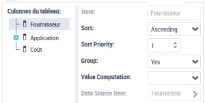 Exemple 2 : à partir d'un Report DataSet qui a pour définition "Applications - Technologies", pour la colonne "Fournisseur" sélectionnez "Ascending" pour trier les fournisseurs par ordre alphabétique.