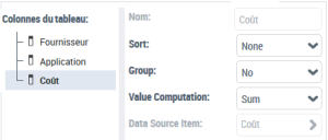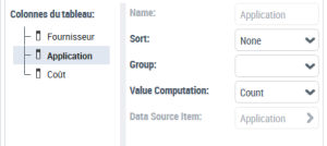 Exemple 2 : à partir d'un Report DataSet qui a pour définition "Applications - Technologies", pour la colonne "Application" dans le champ Calcul de la valeur sélectionnez "Nombre" pour afficher le nombre d'applications par "Fournisseur" et pour la colonne "Coût" dans le champ Calcul de la valeur sélectionnez "Somme" pour afficher la somme des coûts par "Fournisseur".