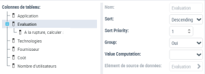 Exemple 1 : à partir d'un Report DataSet qui a pour définition "Applications - Technologies", pour la colonne "Evaluation" sélectionnez "Descending" pour trier les applications par niveau d'évaluation, de la mieux notée à la moins bien notée.