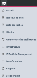 • Tableaux de bord : affiche la liste des indicateurs nécessaires pour le pilotage d'objets tels que des processus, applications ou acteurs de l'organisation. Voir