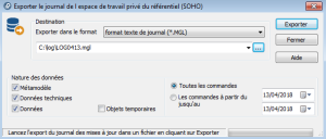 Le format du nom du fichier exporté est "LOGmmjj.mgl", où "mmjj" représente le mois et le jour de l'export du journal.