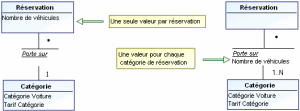 Si le nombre de véhicules est porté par l'association, on peut préciser le nombre de véhicules réservés pour chaque catégorie sur l'association. On peut donc faire une seule réservation pour plusieurs catégories de véhicules (multiplicité 1..N).