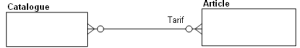 Dans l'exemple ci-dessus, un article peut apparaître dans zéro, un ou plusieurs catalogues et un catalogue peut contenir zéro, un ou plusieurs articles.