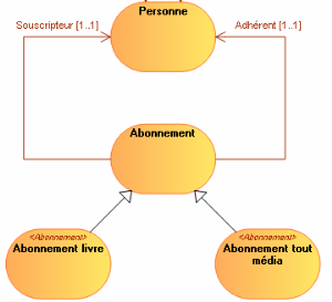Par exemple, le concepts "Abonnement" est décliné en "Abonnement livre" et "Abonnement tout média". Ces deux types d'abonnement héritent des liens "Souscripteur" et "Adhérent" du spécifié au niveau du concept "Abonnement".