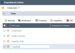 La page des composants affichent les tables de la base de données.