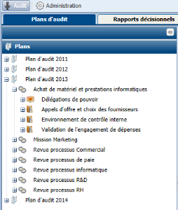 Le volet de navigation Plan d'audit permet au directeur d'audit de visualiser rapidement l'ensemble des plans d'audit et les missions associées.