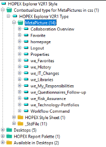 “HOPEX Explorer V2R1 Type” is connected to “HOPEX Explorer V2R1 Style” style sheet. It includes 14 pictures, which overload the corresponding 14 standard pictures in the context of “HOPEX Explorer V2R1 Style”.