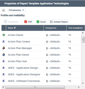 In Profiles and Availability, the Tool Availability parameter defines for each profile, and associated Perspective, whether the Report Template is available to the user or not.