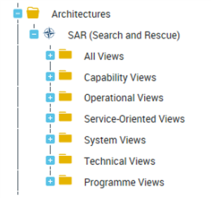 Each architecture displays the following folders which corresponds to one of the seven NAF views: