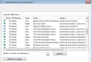 La fenêtre d'Avancement de la comparaison apparaît. Elle présente les différences entre les objets comparés et les modifications qu'ils ont subies.
