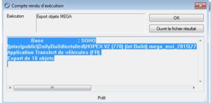 Au cours de l'export, le type et le nom des objets exportés apparaissent en bas de la fenêtre, ainsi que la durée de l'export. A la fin de l'exécution, le Compte rendu d'exécution affiche le nombre d'objets exportés.