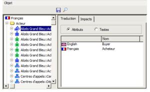 La fenêtre Liste des objets à traduire apparaît. Elle présente les objets à traduire, classés dans l'arborescence de gauche par langue et par type d'objet.