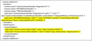 To allow CORS, you must check that the lines in yellow are present in your web.config file.