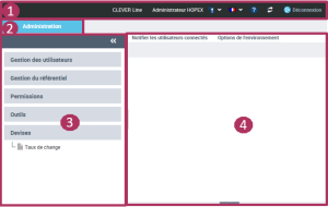 1 : Barre d'outils, 2 : Onglet d'Administration, 3 : Volets de navigation, 4 : Zone d'édition