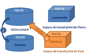 • Pierre ouvre un espace de travail privé, sa vision du référentiel est celle de l'état "n" (R1).
