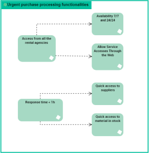The expected functionalities of the project for processing urgent purchases are relative to the response times and to the availability of the application from the rental agencies. The main functionalities are divided into sub-functionalities.