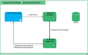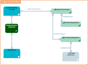 This flow scenario diagram describes the "Spare Parts Purchasing" application.