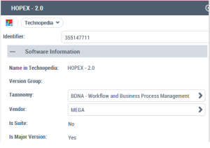 Most of the Technopedia properties imported into HOPEX appear in the Technopedia property page of the object concerned (software technology, technology type or vendor).