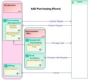 The "Negotiate Contracts", "Receive Deliveries", and "Process Invoices" activities are handled by the "Purchasing Management", "Boat Inventory Management", and "Billing" applications respectively.