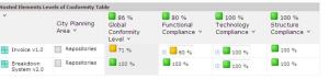 The final table shows compliance levels for each city planning area. In the example below, the "Repository" area displays functional completeness of only 71%, explained by the fact that three of the required functionalities required for this area are not implemented by applications in the area .