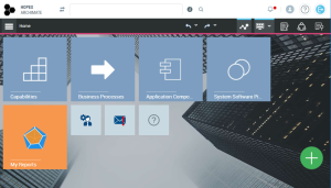 From the Home pane, tiles provide access to main elements inventories across models: Capabilities, Business Processes, Application Components, System Software Pieces or Reports.