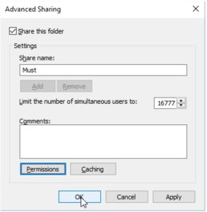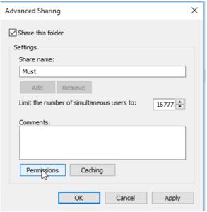 Click “Share this folder”, keep the default share name, and click “Permissions”: